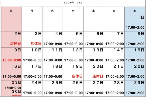 11月の営業予定 2025-10-30 17:44:01 愛知県刈谷市、刈谷駅から徒歩3分のBAR ALMA(バーアルマ)です。【11月の営業予定】9日はエニータイムウィスキーのお手伝いのため、18時オープンとさせて頂きます。-----------------BAR ALMA(バーアルマ)愛知県刈谷市桜町1-47-1 2FJR刈谷駅・名鉄三河線刈谷駅より徒歩3分日〜木 17:00〜0:00 金・土 17:00〜2:00不定休