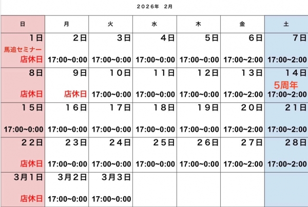 2月の営業予定 2026-02-02 16:15:50 愛知県刈谷市、刈谷駅から徒歩3分のBAR ALMA(バーアルマ)です。【2月の営業予定】-----------------BAR ALMA(バーアルマ)愛知県刈谷市桜町1-47-1 2FJR刈谷駅・名鉄三河線刈谷駅より徒歩3分日〜木 17:00〜0:00 金・土 17:00〜2:00不定休