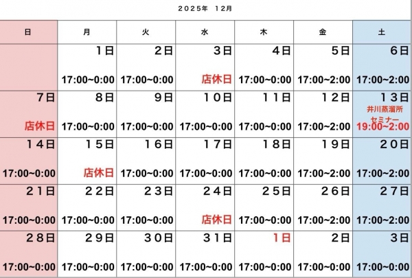12月の営業予定 2025-12-05 16:35:41 愛知県刈谷市、刈谷駅から徒歩3分のBAR ALMA(バーアルマ)です。【12月の営業予定】-----------------BAR ALMA(バーアルマ)愛知県刈谷市桜町1-47-1 2FJR刈谷駅・名鉄三河線刈谷駅より徒歩3分日〜木 17:00〜0:00 金・土 17:00〜2:00不定休