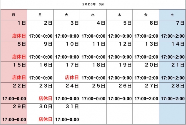 金・土 17:00〜2:00